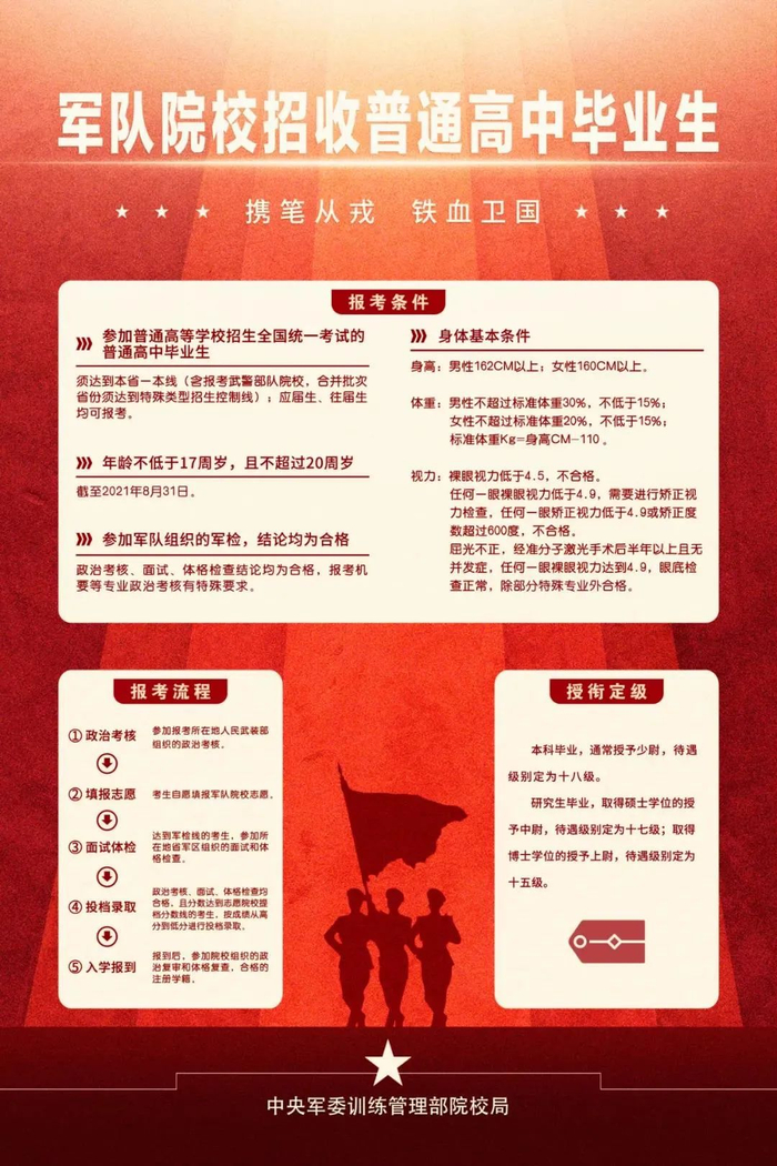 为了让广大考生和家长全面准确地了解军校信息,军委训练管理部院校局开通了“军校招生”官方微信公众号,第一时间发布关于军队院校招生权威信息,建议广大考生和家长关注。同时,考生也可关注各省高招办、军队招生院校、省军区招生工作办公室的官方网站和微信公众号