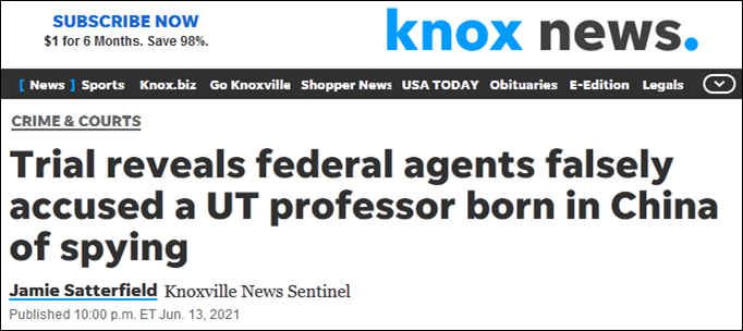 美国田纳西州媒体《诺克斯维尔新闻哨兵报》6月13日披露的庭审信息显示,一名美国联邦调查局(FBI)探员承认诬告华裔教授胡安明(Anming Hu,音译)是“中国间谍”,导致后者被列入联邦禁飞名单(no-fly list),并和其子被监控长达两年。
