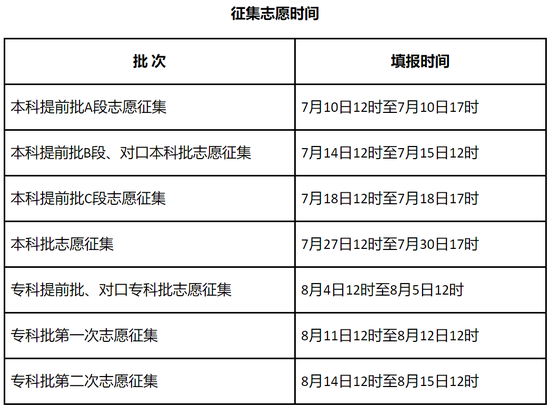 (一)普通类。录取批次分为本科提前批、本科批、专科提前批、专科批等四个批次。一是本科提前批。分为A、B、C三段,每段为一个独立的小批次,依次进行录取。其中,本科提前批A段包括有政治考察、面试、体检等特殊要求的国家专项计划、军队、公安、司法等本科专业。实行以学校为单位的顺序志愿模式。设1次集中填报志愿和1次征集志愿,每次可填报1所学校,每所学校设6个专业志愿和1个专业服从调剂选项。本科提前批B段包括除本科提前批A段以外的其他国家专项计划、公费师范生和免费医学定向生等本科专业。实行以“专业(类)+学校”为单位的平行志愿模式,一所院校一个招生专业(类)为一个志愿。设1次集中填报志愿和1次征集志愿,每次最多可填报96个志愿。本科提前批C段包括高水平运动队、高水平艺术团、高校专项计划、定向就业招生等特殊类型招生本科专业。实行以学校为单位的顺序志愿模式。只设1次集中填报志愿,不进行志愿征集,可填报1所学校,设6个专业志愿和1个专业服从调剂选项。二是本科批。包括未列入本科提前批的普通类本科专业、地方专项计划、本科预科班(包括少数民族预科班、边防军人子女预科班)等。实行以“专业(类)+学校”为单位的平行志愿模式,一所院校一个招生专业(类)为一个志愿。设1次集中填报志愿和1次征集志愿,每次最多可填报96个志愿。三是专科提前批。包括有面试、体检等特殊要求的公安、司法等专科专业。实行以学校为单位的顺序志愿模式。设1次集中填报志愿和1次征集志愿,每次可填报1所学校,每所学校设6个专业志愿和1个专业服从调剂选项。四是专科批。包括未列入专科提前批的普通类专科专业。实行以“专业(类)+学校”为单位的平行志愿模式,一所院校一个招生专业(类)为一个志愿。设1次集中填报志愿和2次征集志愿,每次最多可填报96个志愿。