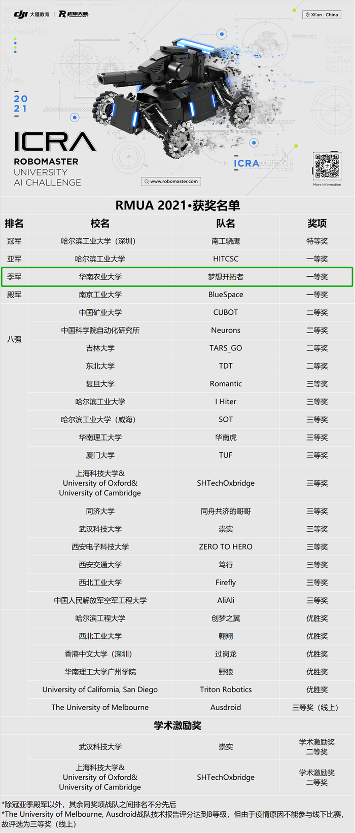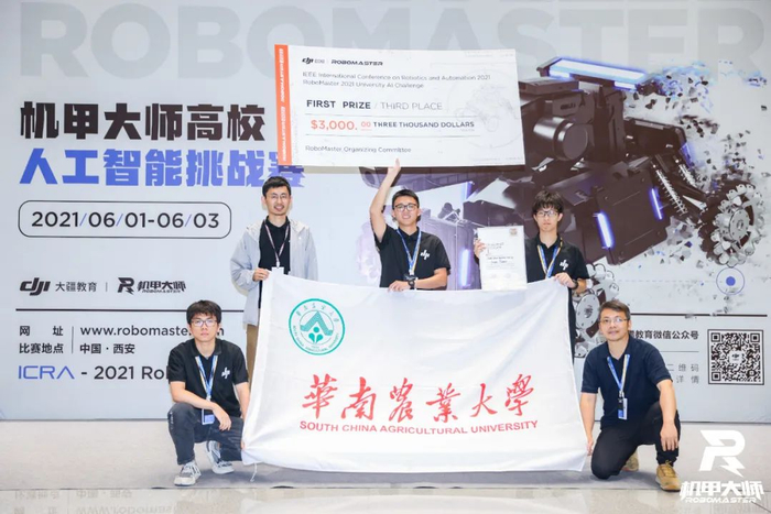 这是一次开创性的成绩,华南农业大学学子们第一次在ICRA RMUA国际赛领奖台上刻上了自己的名字。