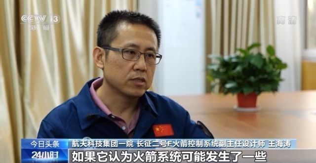 航天科技集团一院长征二号F火箭控制系统副主任设计师 王海涛:相当于它是火箭的一个随身医生,能够来检查火箭的各个系统是否有故障,如果它认为火箭系统可能发生了一些比较严重的故障,影响航天员安全的时候,它就会把这些诊断出来的结果告诉逃逸系统,逃逸系统来完成航天员的逃逸救生这个过程。