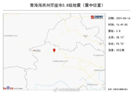 中国地震台网正式测定:06月16日16时48分在青海海西州茫崖市(北纬38.14度,东经93.81度)发生5.8级地震,震源深度10千米。详情