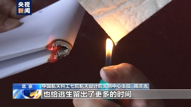 中国航天科工七院航天设计院文创中心主任  陈奕光:同时应用在我们新能源的汽车上,就是电池每个模块之间附上这种材料,隔热作用是非常大的,大大减少了因为能源电池温度过高而引起火灾事故的可能性。如果有火灾发生,也给逃生留出了更多的时间。