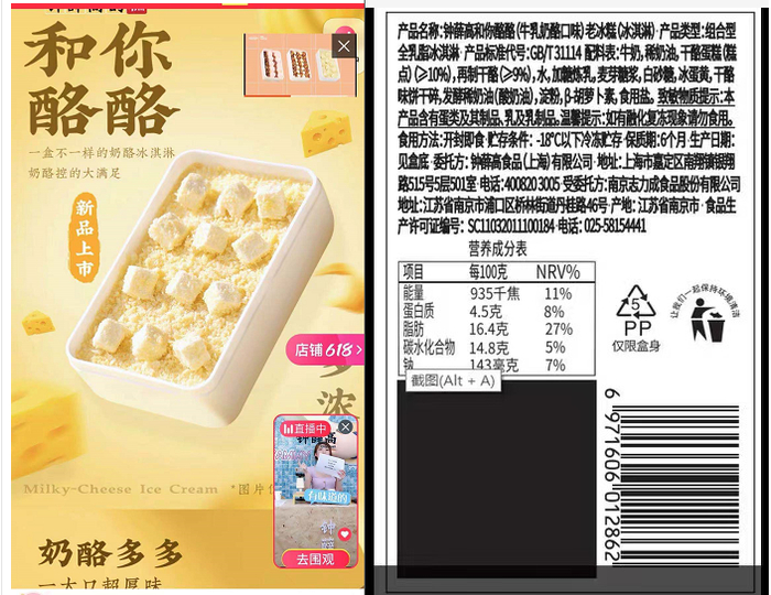 红星新闻记者从店家处了解到,新品糕和你酪酪240g/盒。据其提供的成分表显示,配料主要为牛奶,稀奶油,干酪蛋糕(糕点)(大于等于10%),再制干酪(大于等于9%),水,加糖炼乳,麦芽糖浆,白砂糖,冰蛋黄,干酪味饼干碎,发酵稀奶油(酸奶油),淀粉,β胡萝卜素,食用盐。