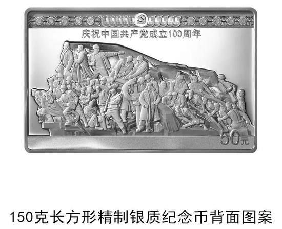 150克长方形银质纪念币背面图案为《攻坚》雕塑局部造型,辅以中国共产党历史展览馆馆徽等组合设计,并刊“庆祝中国共产党成立100周年”字样及面额。