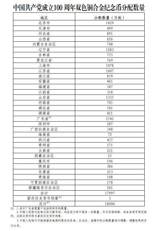 双色铜合金纪念币面额10元,直径27毫米,材质为双色铜合金,发行数量1.8亿枚(含留存历史货币档案3万枚),各省、自治区、直辖市双色铜合金纪念币分配数量如下: