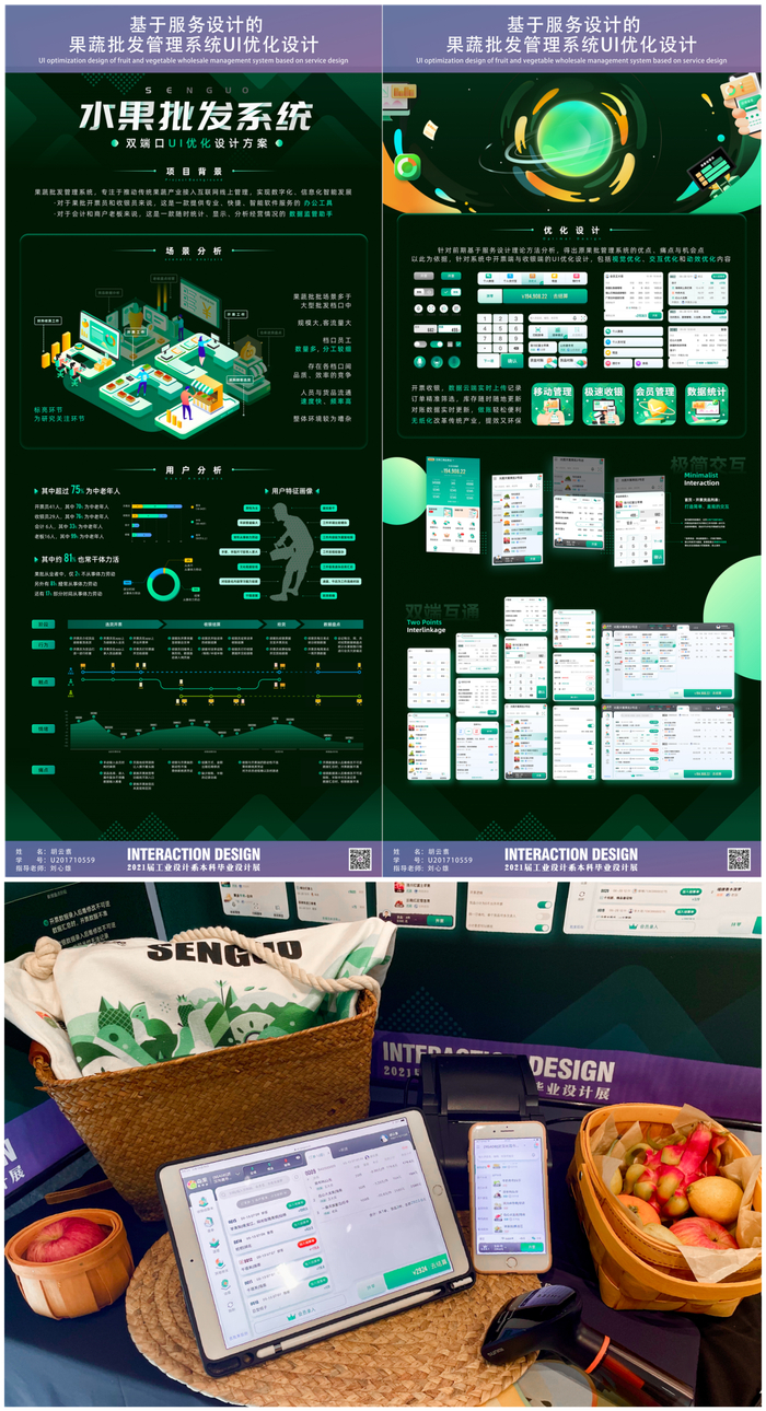 本次毕业设计对我来说是第一次实现从理论到实践的跨越。针对信息化果蔬批发管理系统的这一具体案例,运用服务设计理论方法进行调研、分析、优化设计和效果评估,最终实现信息化系统各端口的正式上线,供果蔬批发商户使用。看到自己设计的系统上线投入使用,看到设计展上观看者兴趣十足地在体验系统,我由衷感到开心和自豪。