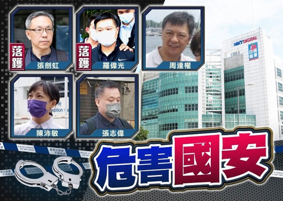被拘捕的5人包括张剑虹、罗伟光,及集团营运总裁周达权、《苹果日报》副社长陈沛敏,以及苹果动新闻平台总监张志伟,警方指他们涉嫌违反香港国安法,串谋勾结外国势力危害国家安全,同时,香港保安局冻结《苹果日报》等三家公司合共1800万港元资产。