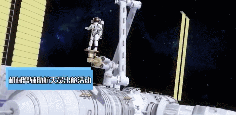 视频介绍,机械臂位于核心舱小柱段,具备舱体爬行功能,并实现舱外状态监视。当机械臂转位实验舱时,可开展空间站建造任务。