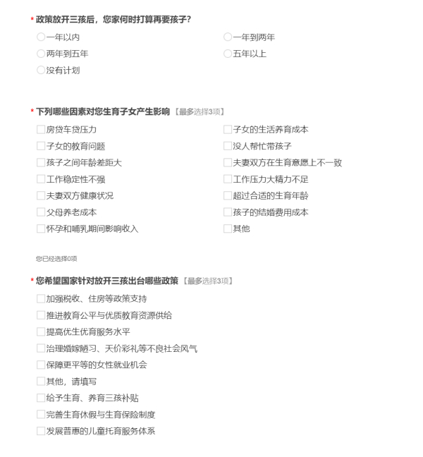 另据山东莘县统计局微信公号消息,为积极响应中央决定,落实应对人口老龄化国家战略,按照上级部署,莘县统计局围绕党史学习教育中“我为群众办实事”实践活动要求,结合部门工作实际,认真组织开展了生育“三孩”意愿调查。本次调查主要通过电子问卷调查的方式,以20—49岁阶段的人员(重点针对此阶段已婚夫妇)为调查对象,全面深入了解调查对象及其父母对生育“三孩”的意愿、不愿生育“三孩”的原因和对“三孩”政策的看法及建议。
