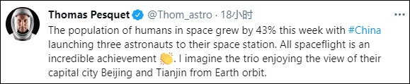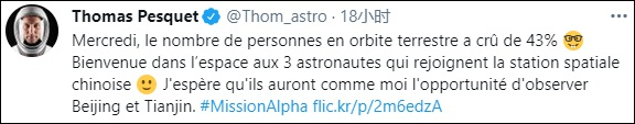 此外,佩斯凯还用法语发推说:“欢迎三名中国航天员来到太空。我希望他们能和我一样,也有机会看到北京和天津。”