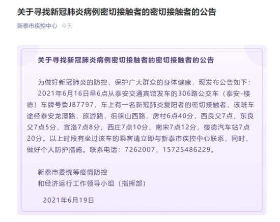 2021年6月16日早6点从泰安交通宾馆发车的306路公交车(泰安-楼德)车牌号鲁J87797 ,车上有一名新冠肺炎复阳者的密切接触者,该班车途经泰安龙潭路,旅游路,徂徕山西路,房村6点40分,西良父7点,东良父7点5分,宣洛7点8分,西庄7点10分,南宋7点12分,楼德汽车站7点20分。以上时段有坐过该车的乘客请立即与新泰市疾控中心联系,同时,做好个人防护措施。联系电话:7262007,15725486229。