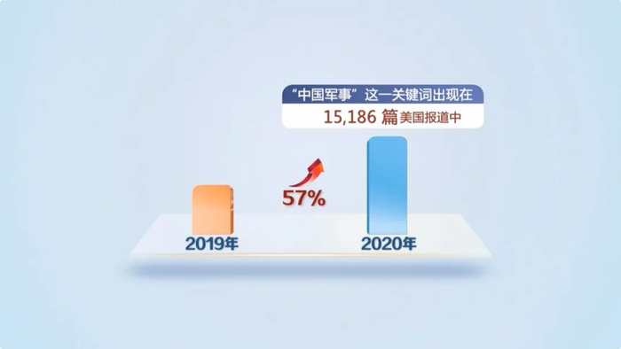 该报告指出,近两年里,美国舆论对于所谓“中国军事威胁”的炒作愈发夸张且数量巨大。以2020年为例,“中国军事”这一关键词出现在了15186篇美国报道中,比前一年增长了57%。