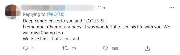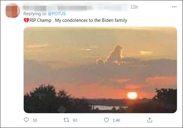 得知“冠军”去世,不少网友在拜登的推文下表示慰问:“对你失去家人,我感到遗憾,狗是人类最好的朋友。”“我们会想念‘冠军’的”“很高兴‘冠军’在穿过彩虹桥(指宠物死亡)前曾到过白宫。”