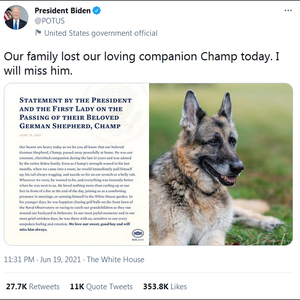白宫在19日发布的声明中写道:“我们怀着沉重的心情告诉大家,我们心爱的德国牧羊犬‘冠军’,在家里平静地去世了。过去13年里,它一直是我们忠实的伴侣,也是整个拜登家族的挚爱。”