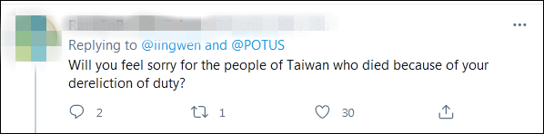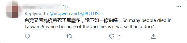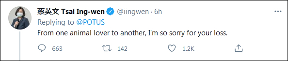 这则“讣告”很快引发众多美国网民关注,数以万计的悼念留言中,台湾地区领导人蔡英文显得格外醒目,她的这条评论也很快“翻车”。网民们批评蔡英文无视因疫情去世和接种疫苗后猝死的台湾民众,却跑去哀悼美国总统的狗。