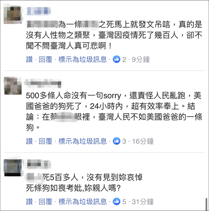 “你认识那条狗吗?(台湾)500多条人命怎么不见你悼念?”“台湾死了那么多人,也不见蔡英文出来默哀。”“吊唁人家的狗无法增加台湾的能见度,只会凸显你的卑躬屈膝。”