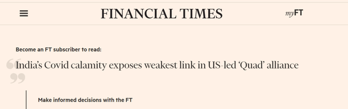 “印度的新冠疫情灾难,暴露了由美国领导的‘四国机制’中的最薄弱一环。” 《金融时报》15日以此为题报道宣称,印度灾难性的疫情不仅打击了它想要成为“世界药房”的雄心,也破坏了美国的计划——在其所谓印度-太平洋地区,让印度在对抗中国影响力方面发挥主导作用。