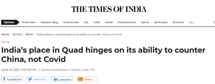 “印度在‘四国机制’中的地位取决于它对抗中国的能力,而不是新冠疫情(应对问题)”——《印度时报》当地时间19日以此为题刊载耶鲁-新加坡国立大学学院政治学助理教授罗汉·慕克吉(Rohan Mukherjee)的文章,隔空回话英媒。