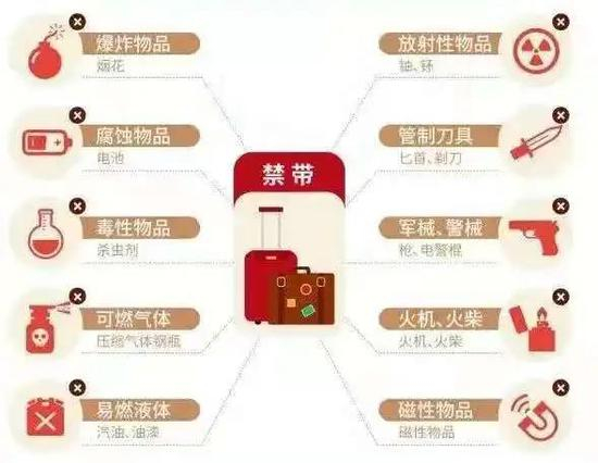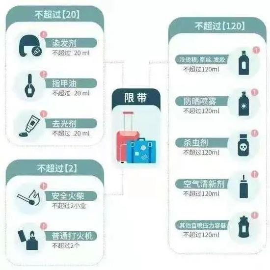 除众所周知的易燃易爆、管制刀具等违禁物品不能携带上车外,疫情防控类用品如消毒酒精、在分装瓶中无法辨认成分的消毒液也不能携带上车。防晒喷雾、发胶等自喷压力容器携带不能超过120毫升,普通打火机不能超过2个。旅客朋友们在乘车前应事先检查携带物品数量和种类,避免出现违法携带和超标携带限带物品的情况发生。