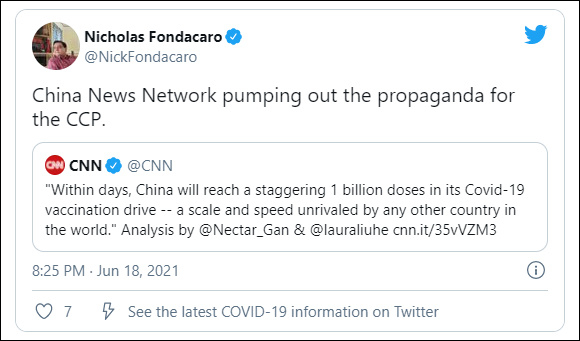 福克斯新闻网指责CNN“援引中国官方数字吹嘘中国新冠肺炎疫苗接种率”,因此外界指责其为中国“宣传”。福克斯新闻声称,CNN没有提供任何“关于中国国产疫苗拥有有效性的数据”。