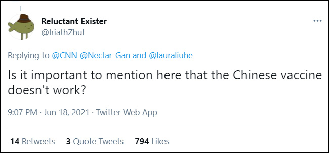 值得一提的是,由于美国各个媒体长期选择性报道中国,不少美国网友对于中国的认知已经到了彻底偏离事实的地步,比如有些美国网民依旧认为,中国时至今日没有控制住疫情,中国的一切“都是共产党的宣传”。另外一些网友则坚称中国疫苗“没有保护力”。