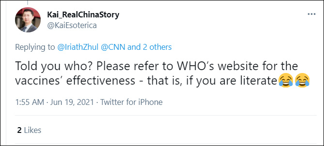 在CNN的高赞评论下,有一位美国网民宣称,要不要提醒CNN,中国的疫苗“没有保护力”,另外一位美国网民则对着中国的新冠疫情确诊数字说,中国控制住了疫情,没有第二波疫情,足以说明中国的数据“可疑”……