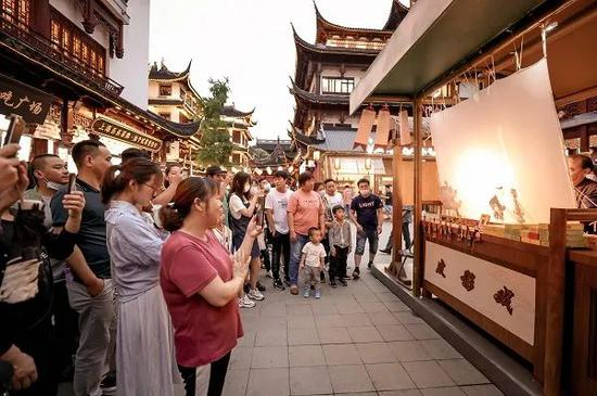 ■日前,豫园首届沉浸式夏日江南市集开幕。市民游客可在豫园商城中心广场参加主题打卡活动,边游园边探秘园内江南文化。