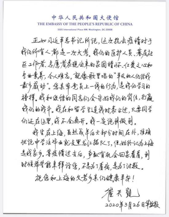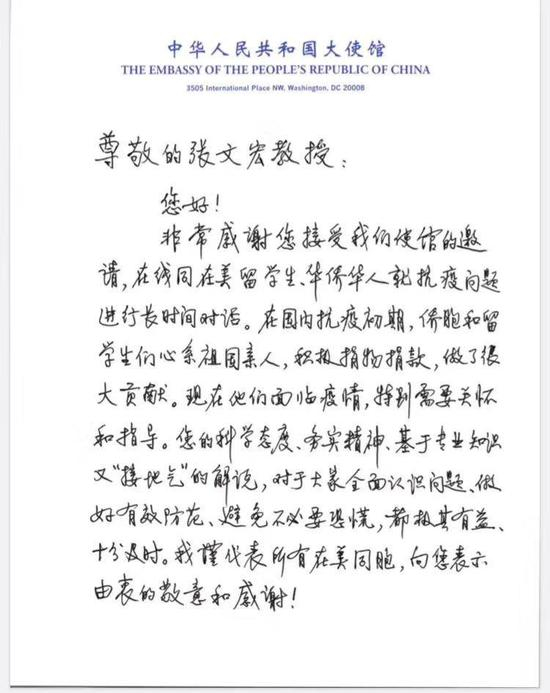 2020年3月26日,张文宏应中国驻美大使馆的邀请,通过视频的方式给在美华人上了一堂防疫课。随后,崔天凯动笔,用一封工整的手写信,向张文宏表示了谢意。信中的崔天凯更是直言,“只要同学们还在这里,我不会离开。我一定说到做到。”