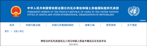 中国常驻日内瓦代表团网站6月21日消息,常驻日内瓦代表团发言人刘玉印就人权高专错误言论发表评论,全文如下: