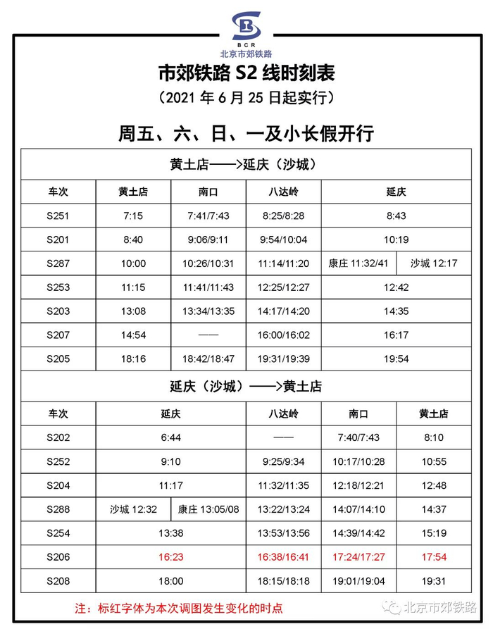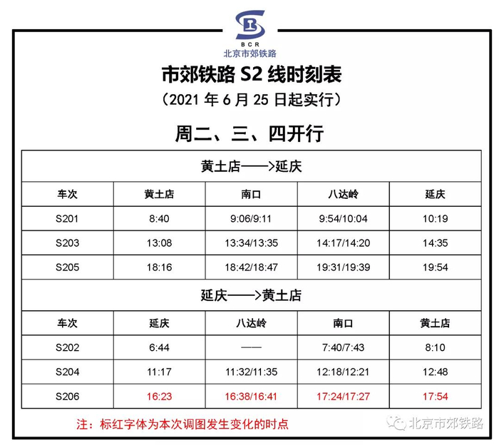 6月25日起,北京S2线S206次列车开行时点微调
