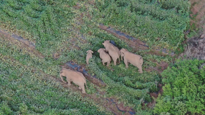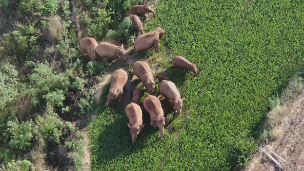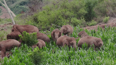 象群在玉溪市峨山县大龙潭乡觅食。