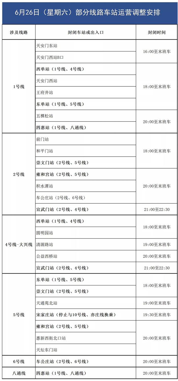 五、20:00至末班车:1号线五棵松站封闭;1号线四惠站、八通线四惠站封闭,停止换乘;2号线积水潭站封闭;2号线雍和宫站、5号线雍和宫站封闭,停止换乘;2号线车公庄站、6号线车公庄站封闭,停止换乘;4号线公益西桥站封闭;5号线惠新西街北口站、天坛东门站封闭。