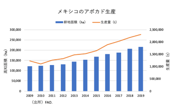 墨西哥牛油果耕地面积(蓝色,单位:公顷)与产量(橙线,单位:吨)数据源:联合国农粮组织