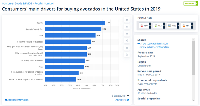 推广牛油果的团体“哈斯牛油果委员会”(HAB)2019年5月的调查显示,促使美国人购买牛油果的最主要原因是“健康”(heathy),其次是“含有‘优质’脂肪”(contain ‘good’ fats),最后才是它的味道(taste)。74%的牛油果消费者是因为牛油果促进健康而购买。