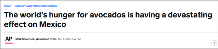 美联社2016年报道《世界对于牛油果的追求对墨西哥造成毁灭性影响》