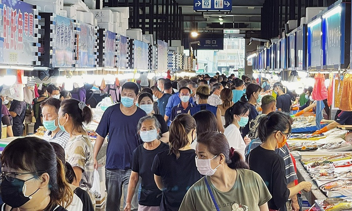 2021年6月20日,中国台湾,高雄梓官区蚵仔寮观光鱼市场内外下午涌进大批购买海鲜民众,却未拉出彼此的社交距离,图自澎湃影像。