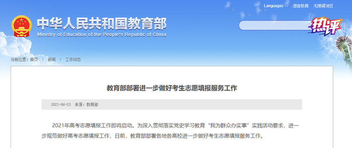 6月23日起,各地高考陆续“放榜”,考生志愿填报受到高度关注。教育部23日发布通知,部署各地各高校进一步做好考生志愿填报服务工作。各地要精心组织实施“五个一”志愿填报咨询服务活动,即至少开展一次覆盖全体师生的志愿填报政策培训、提供一本志愿填报指导材料、组织一场线上直播咨询活动、播出一档电视或电台政策宣讲节目、发布一期志愿填报预警信息。
