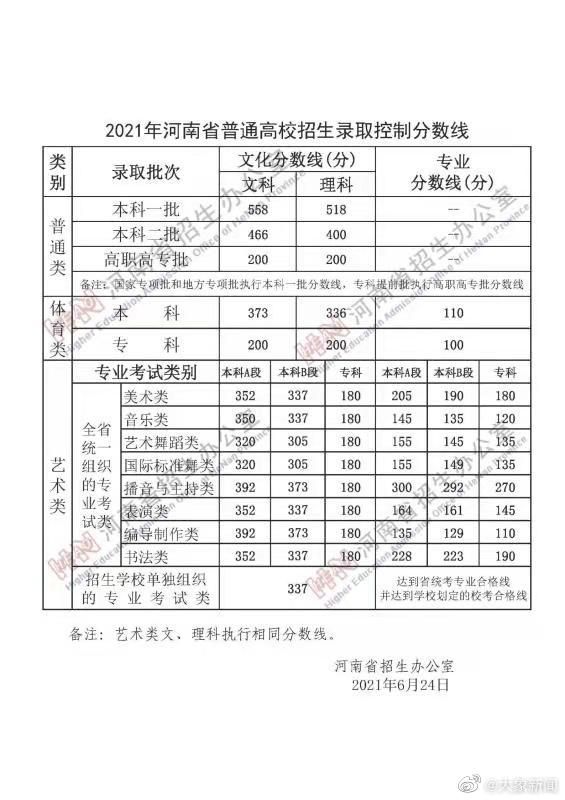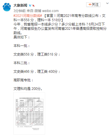 原标题:官宣!河南2021年高考分数线公布:文科一本558 分,理科一本 518分
