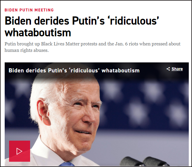 上周,“普拜会”结束后,面对美国记者的提问,普京用美国“黑人的命也是命”运动和“冲击国会山”举例反驳。但美国“政客”新闻网(Politico)又给普京打上“那又怎么说主义”标签,还援引拜登在记者会上的话说,“那是个荒谬的类比”。