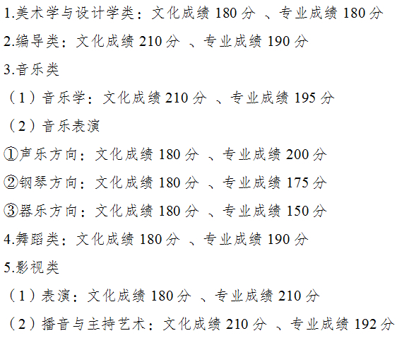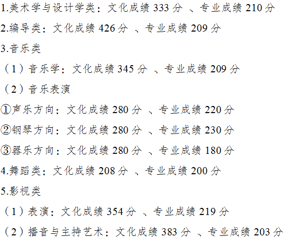 艺术类、体育类根据艺术类各类别、体育类考生文化成绩及专业统考成绩,按照招生计划数的一定比例,综合生源等情况,分别划定艺术类各类别本科、专科和体育类本科、专科录取最低控制文化分数线及专业分数线。