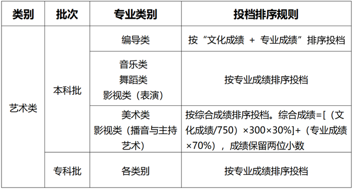 艺术类专业平行志愿在考生文化成绩、专业成绩分别达到我市当年最低录取控制分数线的前提下,根据下表中的投档排序规则进行投档。