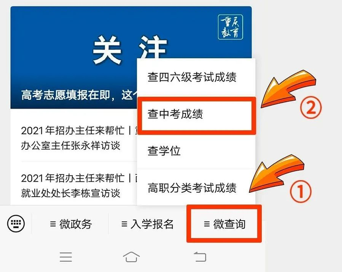 进入“重庆教育”微信公众号,点击①“微查询”→②“查中考成绩”进入查询页面,即可输入准考证号和中考填报志愿时设置的密码,查询中考成绩。