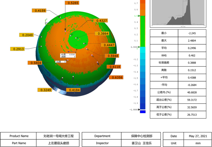 本次大修综合检测是对该中心技术力量的考验,促使技术人员不断提升检测能力和理论水平。本次大修期间共进行位移观测5次、沉降观测5次,结果显示在闸室抽水前、抽水中及抽水后未发生明显较大上浮或下沉,闸室墙保持稳定状态。土建部分总体技术状况一般,无重大缺陷和重大安全隐患,总体合格,能正常使用。闸门部分顶枢轴和蘑菇头外观较好,无明显啃伤、无裂纹;顶枢轴硬度、顶枢轴衬磨损量、蘑菇头帽磨损量等均在范围内;阀门门体状况较好,无明显变形、损坏现象,背拉架无明显磨损,门体表面附着杂物较多,部分区域涂层有起鼓现象。针对阀门滚轮系严重磨损这一情况,该中心检测人员又结合船闸运行实际提出可行性建议,圆满地交出大修保障答卷。