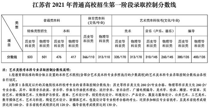根据教育部招生工作规定,实施高考综合改革及合并本科批次的省份,须参照往年文理科类本一批次招生计划比例划定特殊类型招生控制分数线。《江苏省2021年普通高等学校招生工作意见》明确规定,特殊类型招生控制分数线按照普通类(历史等科目类)、普通类(物理等科目类),参照往年文理科类本一批次招生计划比例分别划定。