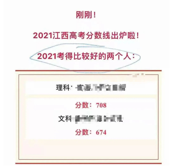 在江西,某公众号在公布江西高考分数线的同时,还特意点出了“考得比较好的两个人”的成绩和学校……