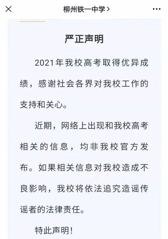 24日,柳州铁一中通过官方微信公众号发布严正声明,表示“近期,网络上出现和我校高考相关的信息,均非我校官方发布。”
