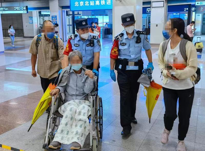 6月23日8点30分,由张家口开往北京北的G7872次列车正点驶入北京北站。北京铁路公安处北京北站派出所民警霍小阳和郝进达在东一出站口治安检查站疏导下车旅客有序出站。突然,一名女士惊呼说:下雨了,怎么办,这可怎么办?两名民警闻讯后立即上前了解情况。该女士叫张某,刚和父亲母亲从张家口市坐高铁来京。张某说:母亲患有股骨头坏死病,近期突感身体不适病情加重。经张家口市医院检查,确诊母亲患有血液病,这次就是陪着母亲来京治疗的。谁成想刚到北京就下起了大雨,又没带够雨具,天气又湿冷,母亲的身体怎么能禁得住啊。不去医院吧,之前挂的号就废了。了解情况后,霍小阳和郝进达立即上前安慰说:有我们在,一定能帮助您早点就医。说完,霍小阳就起推患者的轮椅,郝进达撑起雨伞,将张女士一家送到出租车停车区。随后,他们又将患病老人抬上出租车,并贴心的包紧盖严毛毯,叮嘱出租车司机老人身体不好怕着凉,路上可以打开暖风。一家人的担心化解了,张女士很是感动,对热心帮助他们的民警深鞠一躬表示感谢。她说:警察就是老百姓最坚实的后盾,真心感谢你们!