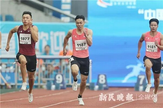 ■ 全国田径锦标赛暨全运会资格赛24日在重庆开幕。在男子百米决赛中,苏炳添(图右)因腿部肌肉不适仅以11秒50名列第六,广东“00后”小将陈冠锋(图中)以10秒06勇夺第一。