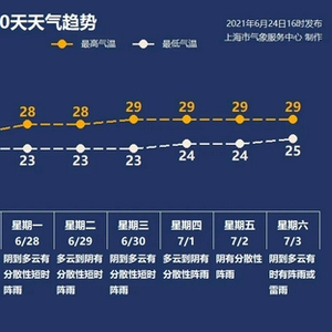 上海天气:24-30℃,多云到阴,今天半夜到明天阴有阵雨或雷雨